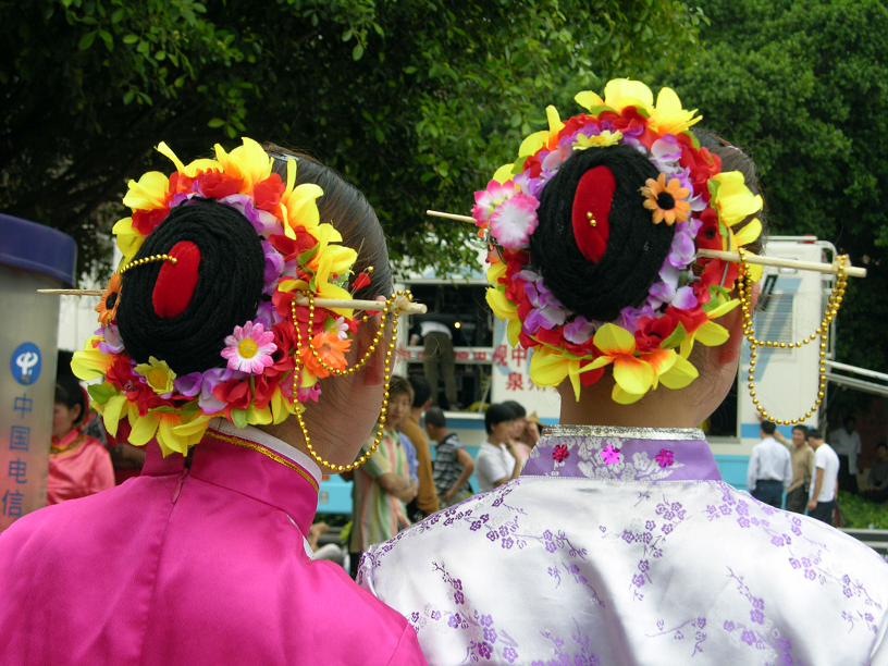 Villages like Xunpu live on fishing. Therefore local women developed clothing and headwear fit for related labor work. They wear large blouses with wide sleeves (the colors are often blue-green or light blue), and wide black trousers. They like flowers. When the girls are 15 years old, their hair are braided, coiled up, and decorated with seasonal flowers and a hair clasp. It is said that such hair and dress style dates back to the Eastern Jin period. The frangipani, banana shrub and groundsel flowers – popular hair decorations – are said to be transplanted by Pu Shousheng, an Arab in the Song or Yuan dynasty.