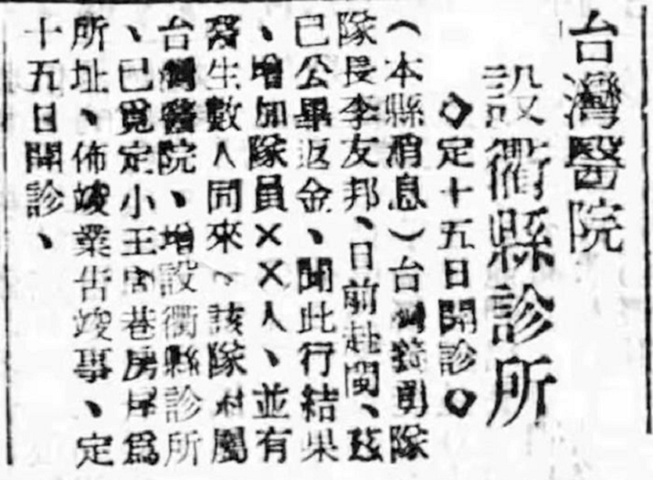 《东南日报》1939年9月5日报道《台湾义勇队在金热心施诊》(图一):“台湾义勇队自在本县创设医室,免费治疗以来,一般清贫病人已蒙益匪浅,近往求诊者更日益增加。顷悉该队为适应病家要求起见,及(即)将治疗范围扩大,凡内外科、花柳科、小儿科、眼科、咽喉科、妇人科均兼而有之,病家所需药物亦每日由该队医室派人轮流代办,除收回货价,其余概不取分文。查该队医师颇多学识优良,经验丰富者。各科都有专人负责,同时,经常在金华酒坊巷18号及方六乡牌塘两处应诊云”。这里报道的台湾义勇队医室,后来改名为台湾义勇队附属台湾医院(第一台湾医院)。该院曾在义乌县义亭镇和金华县建头塘设立两个分诊所。